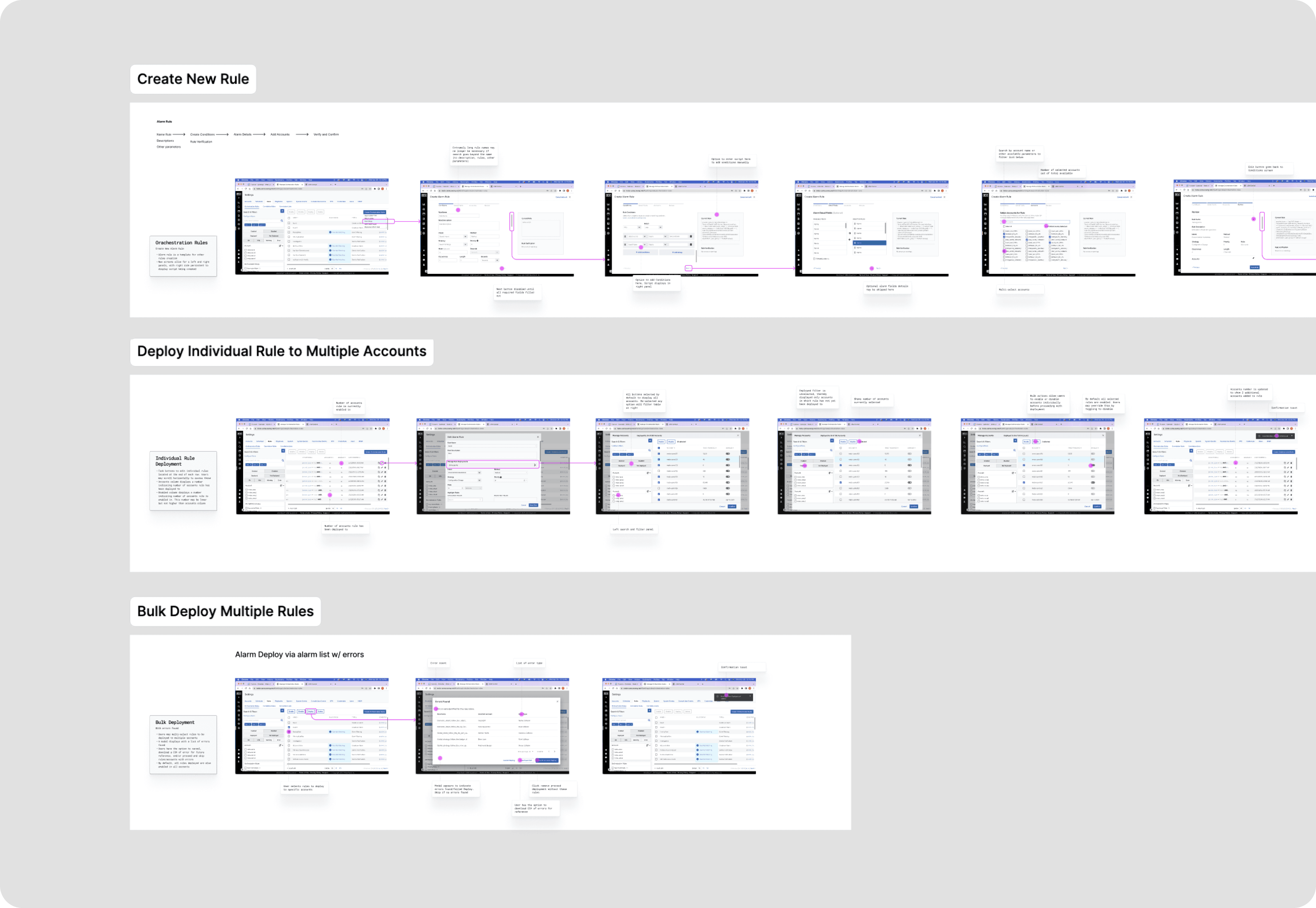 I began with a comprehensive audit of the existing platform, identifying redundancies in navigation, filtering, and system structure. This revealed that much of the friction came not from the data itself, but from how it was organized and accessed. From there, I restructured the information architecture to support multi-tenant workflows under a single system. Instead of organizing around legacy structures, the experience was aligned to key workflows and information types, such as environment and threat source, making it easier for analysts to move between accounts and investigations without losing context. In parallel, I focused on how to present complex security information to non-technical users without overwhelming them. This involved prioritizing key signals, simplifying language, and designing role-based dashboards that surfaced only the most relevant information for each audience. Instead of exposing raw data, the experience emphasized clarity — helping users quickly understand what was happening, what required attention, and how to interpret system activity without needing deep domain expertise. To support scale, I introduced interaction patterns that allowed actions to be applied across multiple accounts at once. One of the most impactful features was the ability to bulk apply rules across hundreds of customer environments, significantly improving efficiency and reducing the risk of user error. Throughout the process, I used a mix of rapid, low-fidelity, and high-fidelity prototypes and detailed interaction documentation to communicate system behavior clearly to engineering, ensuring that complex workflows could be implemented accurately.