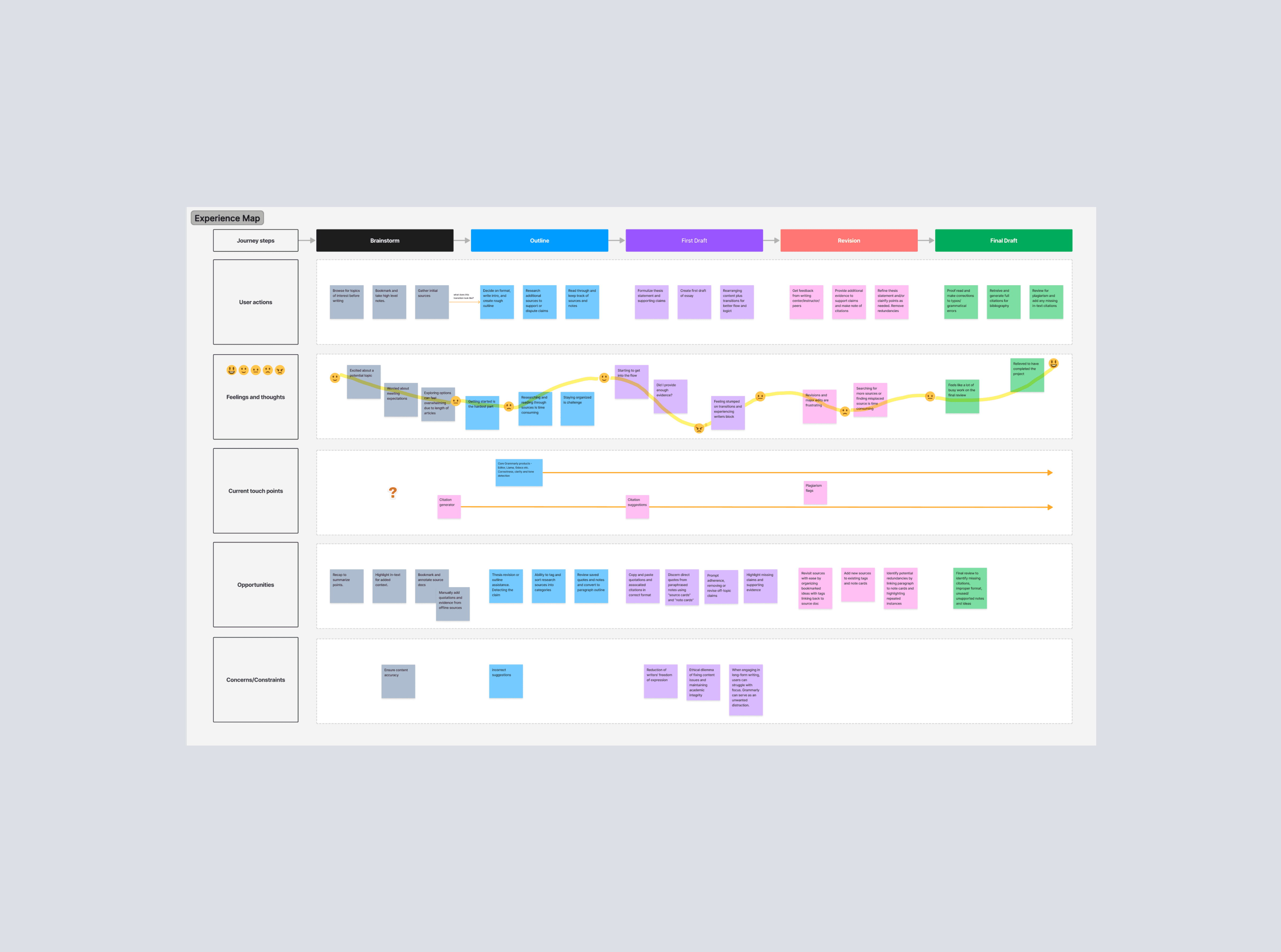 For students working on long-form essays, research is not a single step — it happens continuously throughout the writing process. Students move between reading, extracting key ideas, organizing notes, and incorporating sources into their work. The result is a workflow spread across tabs, documents, and tools that don't talk to each other. A significant portion of a student's effort goes toward logistics like tracking sources, copying citations, and relocating material they've already read, rather than the actual thinking the assignment requires. Grammarly’s research showed that high-performing students were especially motivated to reduce this overhead. They weren’t looking for shortcuts, but for tools that would help them stay organized, save time, and maintain clarity as their work evolved. The challenge wasn't helping students read or write in isolation. It was supporting the entire research lifecycle in a way that felt cohesive and unobtrusive.