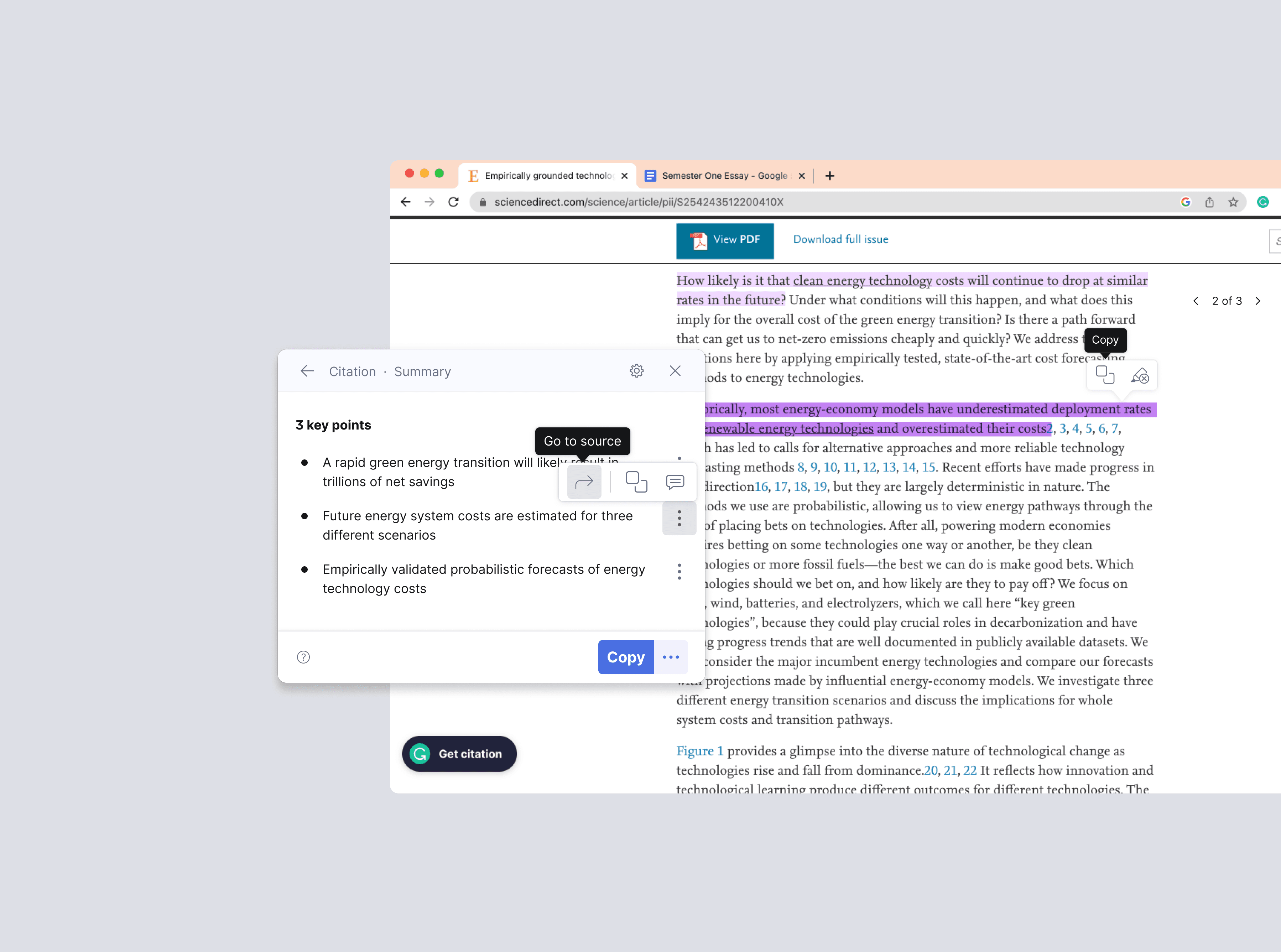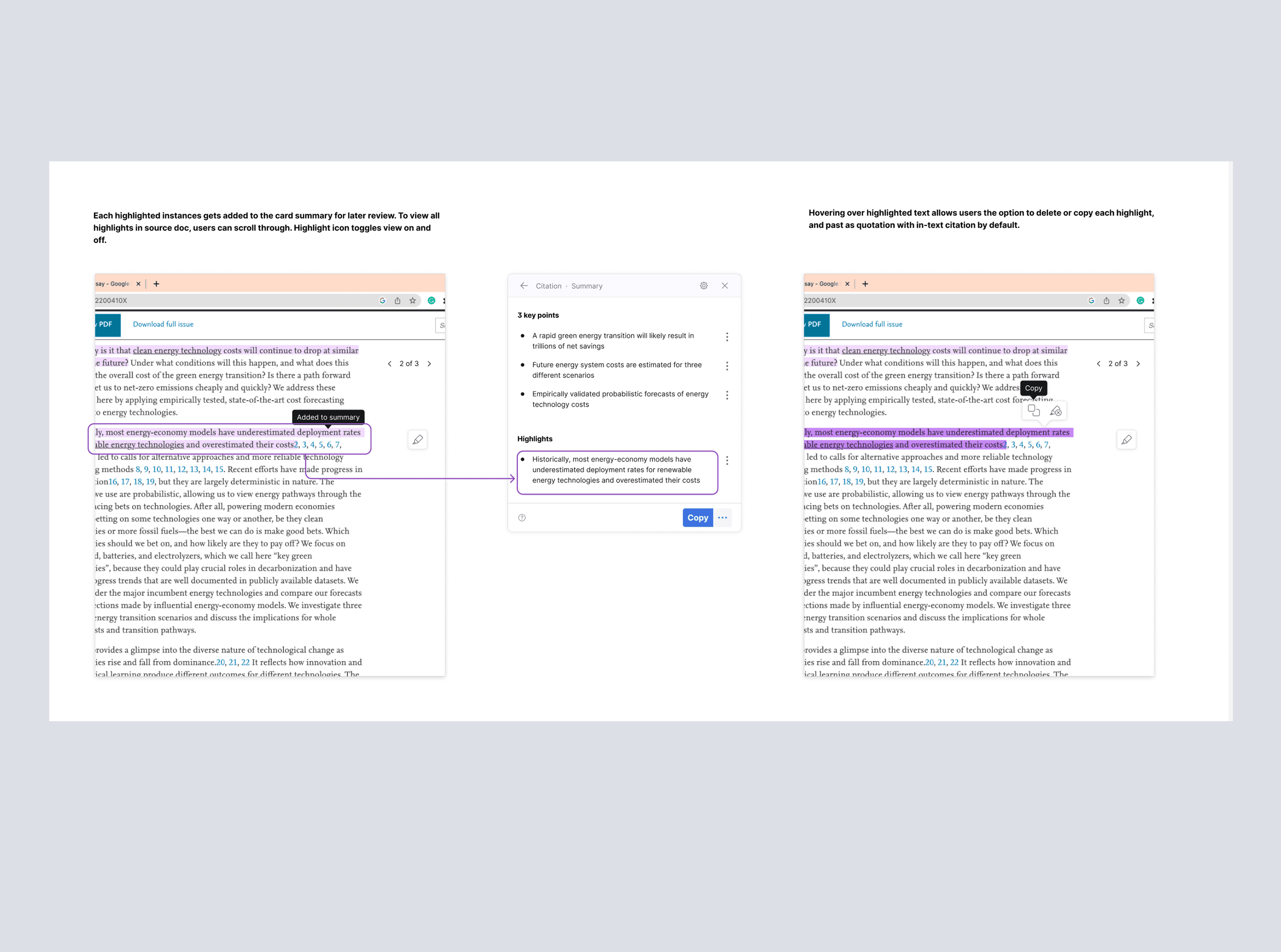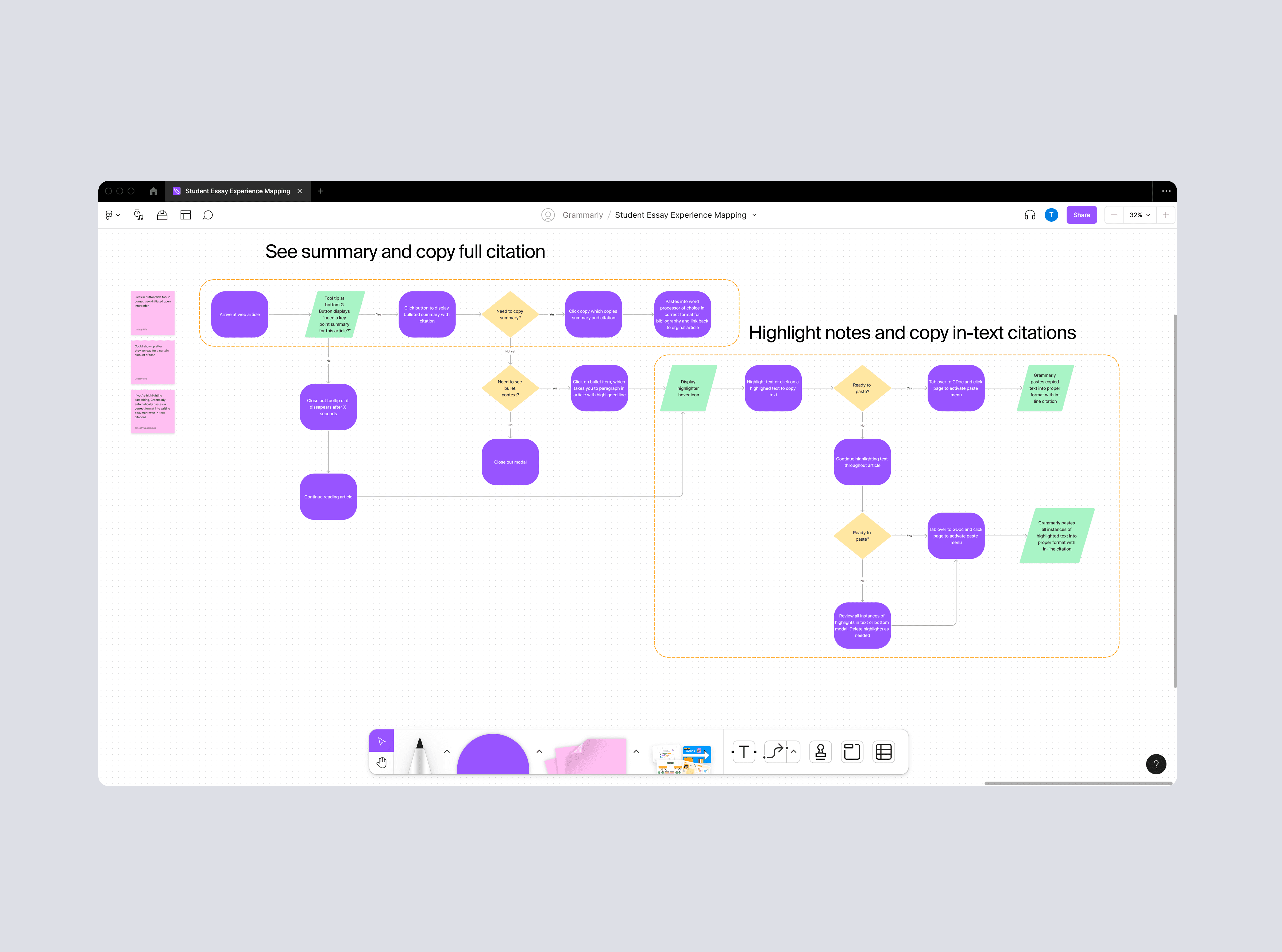 I approached the problem by first mapping the full lifecycle of long-form writing, identifying how research shows up at different stages rather than treating it as a single task. This revealed that the type of support students need shifts depending on the stage of a project, from quickly understanding a source, to capturing key insights, to retrieving and applying those insights during writing. From there, I structured the experience around these moments. Early in the process, the focus was on summarization, helping students quickly grasp the core ideas of an article. As they moved into deeper research, the experience supported highlighting and note-taking, allowing key points to be captured and stored. During composition, those notes became accessible in context, making it easy to reference material, insert citations, and continue writing without breaking flow. Finally, the system supported formatting and organizing sources into complete citations and annotated bibliographies. A key part of the work was defining how these capabilities would live within Grammarly’s existing ecosystem. Rather than creating a separate tool, I explored multiple entry points — starting from reading, writing, or citation management, and designed flows that allowed users to move between them seamlessly.