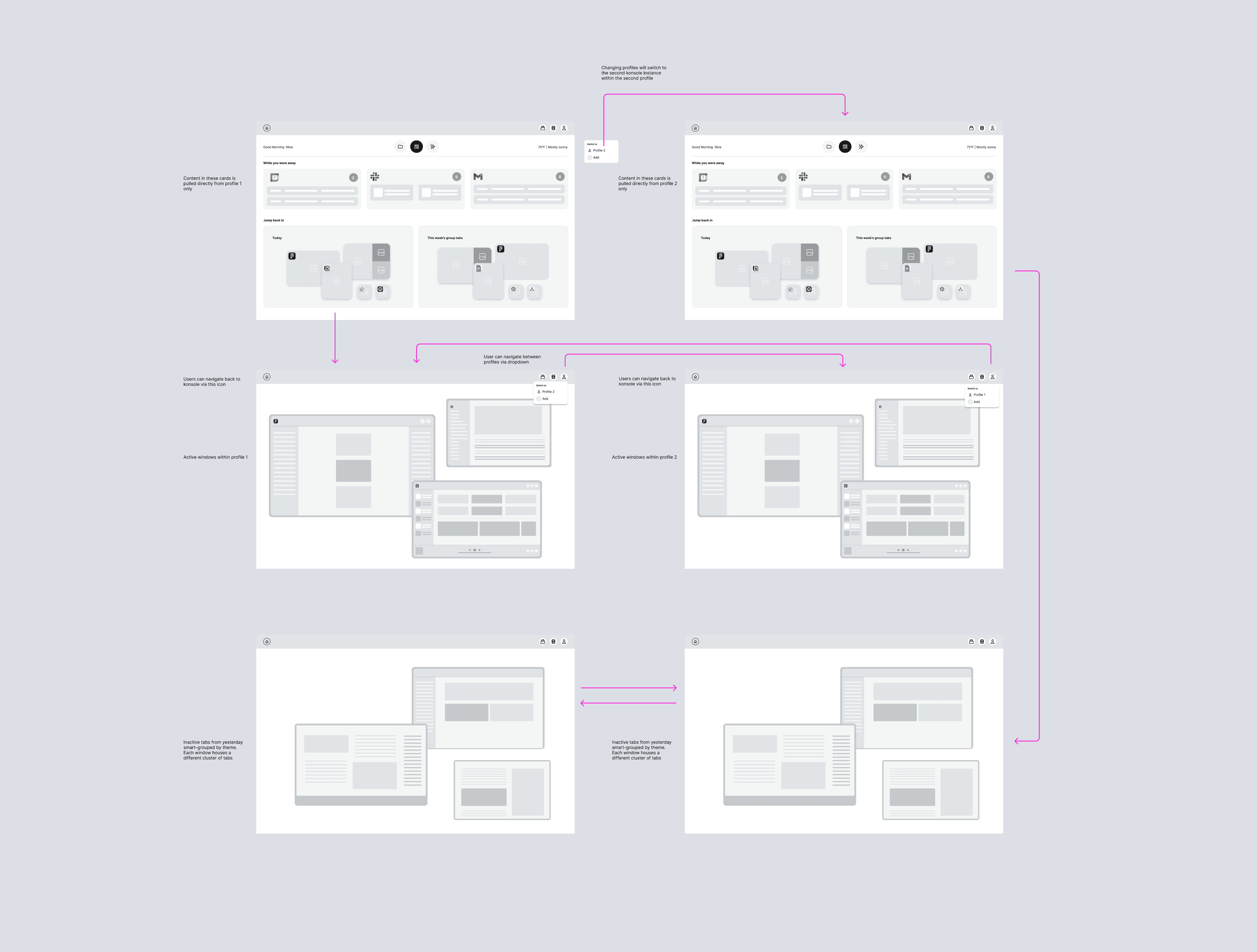 The design process began with a workshop to uncover user browser habits, revealing patterns, pain points, and opportunities for AI-enhanced workflows. Insights from the workshop guided ideation on the dynamic dashboard and search results page, exploring how AI could surface relevant information and streamline multitasking. We also iterated on the Omnibar and reorganized windows, tabs, and groupings, experimenting with new information architecture patterns to support context, role, and intent. Throughout, we focused on balancing user control with AI assistance, ensuring the system felt intelligent yet predictable. Prototyping and testing early concepts helped validate ideas quickly, shaping the beta launch and providing a foundation for ongoing iteration as the AI and user patterns evolve.