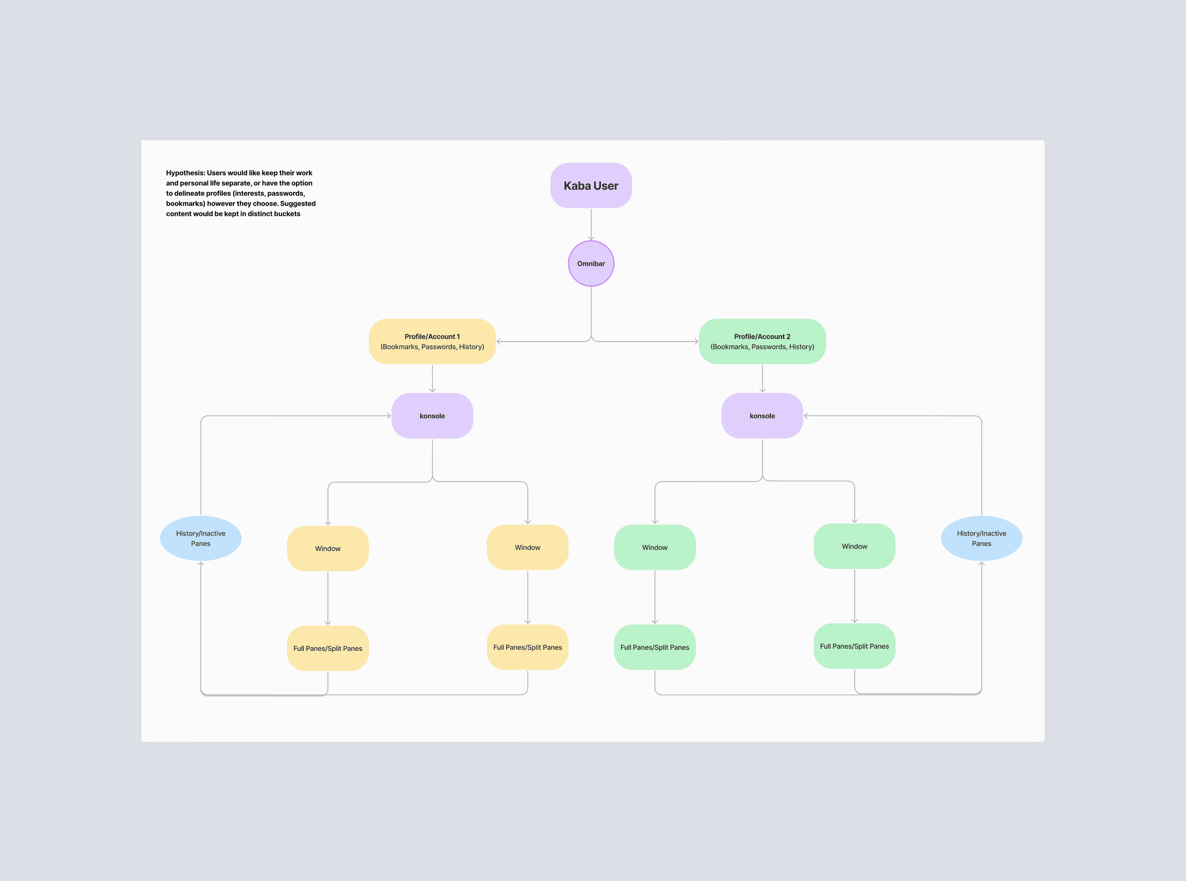 Kaba, an AI-powered web browser was designed with a clear goal: to differentiate the browser by making it personal, intelligent, and workflow-aware. The project focused on identifying which browser behaviors users already depend on, where those patterns break down, and how a personalized language model could meaningfully improve them. Through research, I uncovered key pain points around information overload, context switching, and organization. From this, I explored new ways to structure the browser around roles and interests—using AI to automatically organize windows, tabs, and smart category groupings. All interactions are unified through a centralized Omnibar, giving users a single, intuitive place to navigate, manage context, and control the browser.