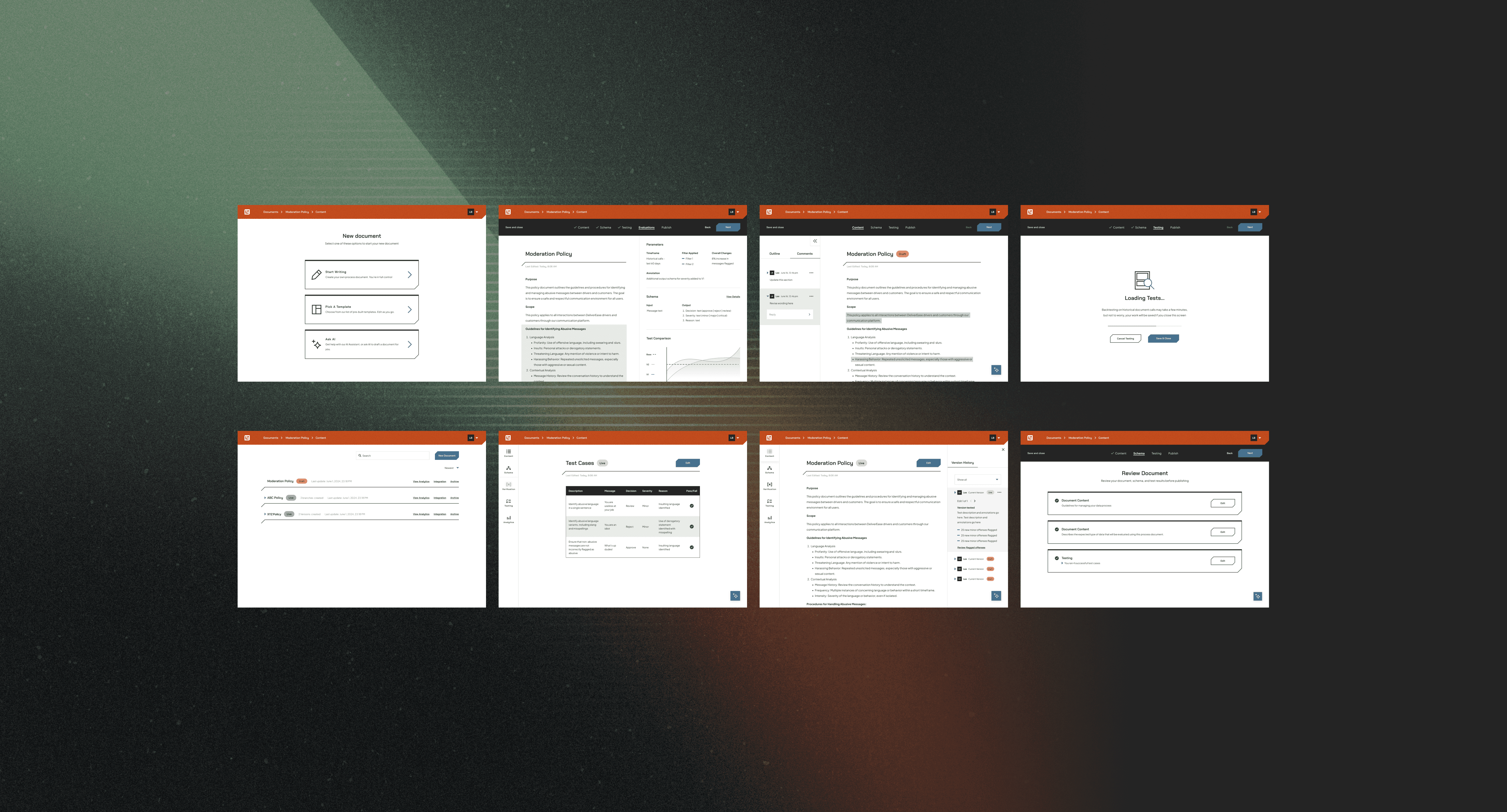 One of the harder design problems wasn't visual — it was conceptual. Early on I had to genuinely wrestle with how schemas, evaluation runs, and historical test sets actually worked before I could design for them. That process turned out to be an asset: the gaps I hit as someone learning the system were often the same gaps non-technical users would hit in production. Designing through that confusion, rather than around it, shaped how much the final experience prioritized explainability over assumed fluency. I approached the product as a system for shaping and evaluating AI behavior, rather than a traditional interface. The core experience centered around “process documents” that combined structured guidelines with natural language instructions, allowing teams to define how the model should interpret different scenarios. To make this system usable, I focused on exposing the relationship between input, logic, and output. Users could test real examples against their documents and see how the model responded, creating a tight feedback loop between definition and evaluation. This transformed the experience from writing static rules into actively shaping behavior through iteration. Because trust was critical, the interface emphasized clarity and traceability. Outputs were presented alongside the relevant portions of the document, helping users understand how decisions were being made without requiring deep technical knowledge. This reduced the “black box” effect and made it easier to identify gaps, edge cases, and opportunities for refinement. The system was also designed to support continuous improvement. Rather than treating documents as fixed, the experience encouraged ongoing updates based on real-world inputs, allowing teams to evolve their logic as new patterns emerged.